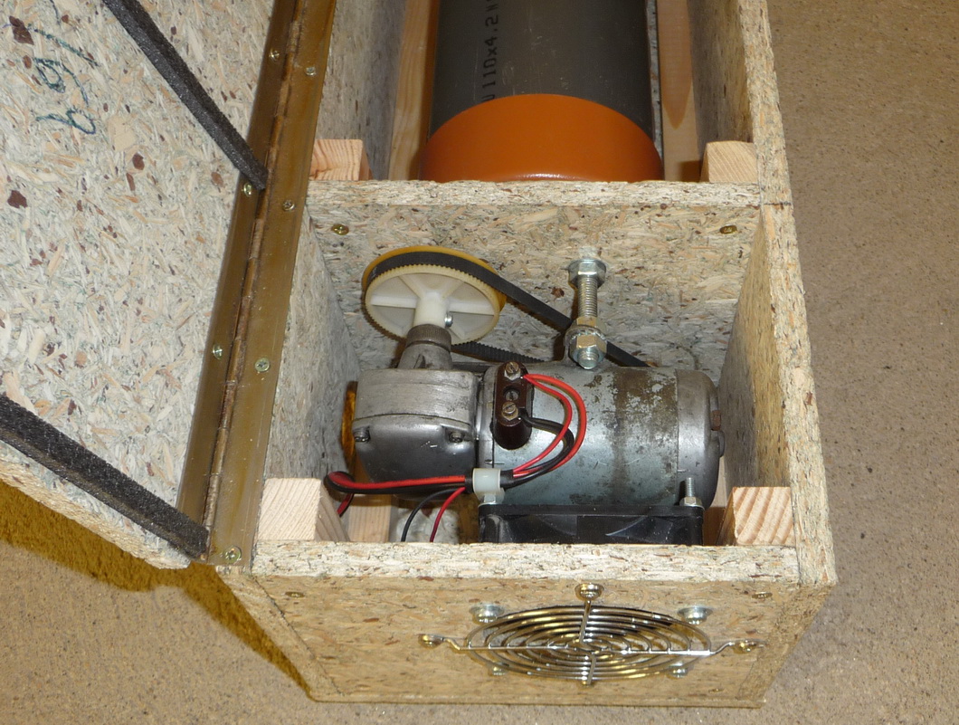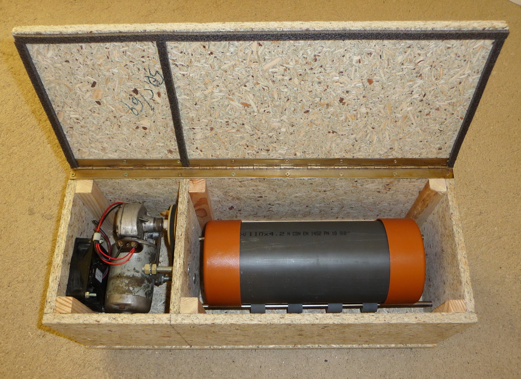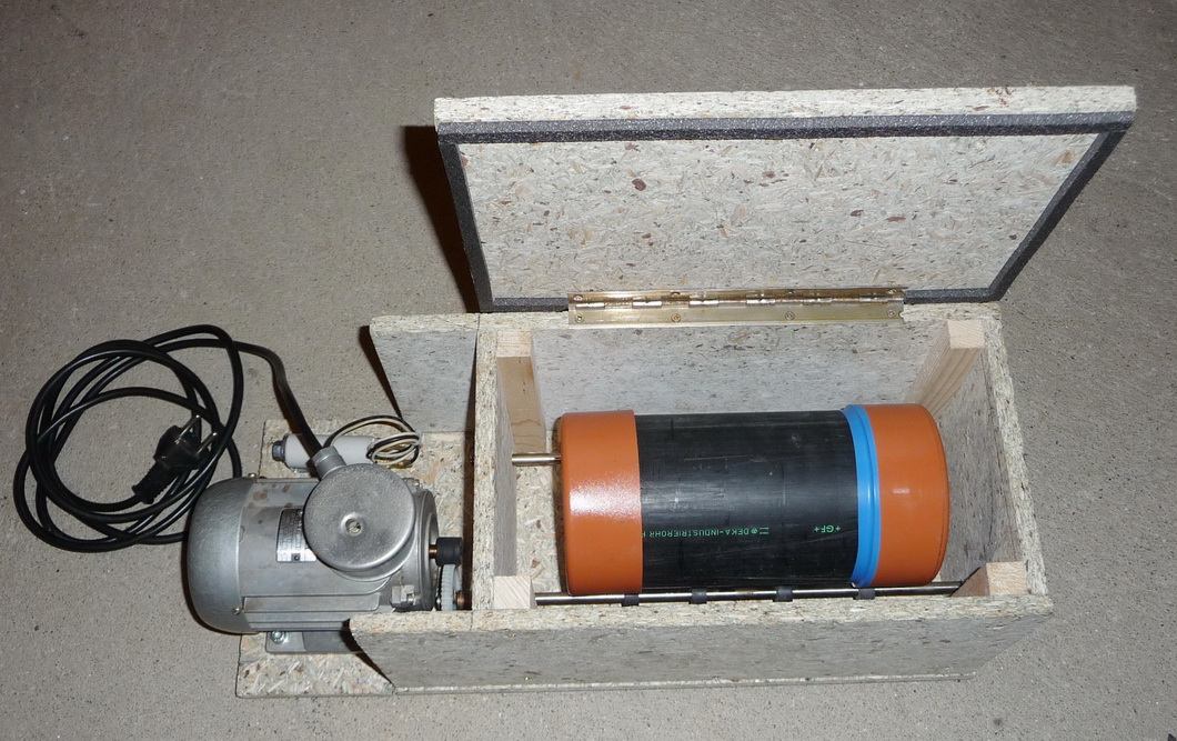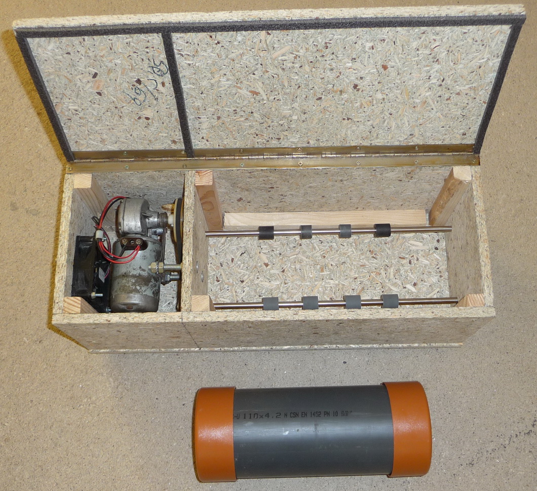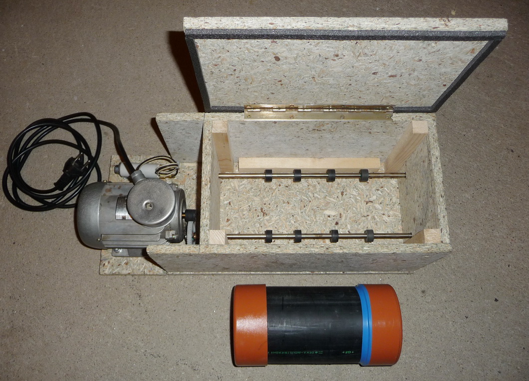 Celý mechanizmus je namontován do dřevěné krabice s víkem, aby se snížila celková hlučnost. Motorek je od mlecího tělesa navíc oddělen přepážkou pro případnou jiskru nebo zkrat. Rozmělňovací válec je vyroben HD-PE trubky 110x4,2 s převlečnými zátkami. Mlecí válec se otáčí cca 35 otáček za minutu, což je docela málo a tím je třeba delší čas mletí.