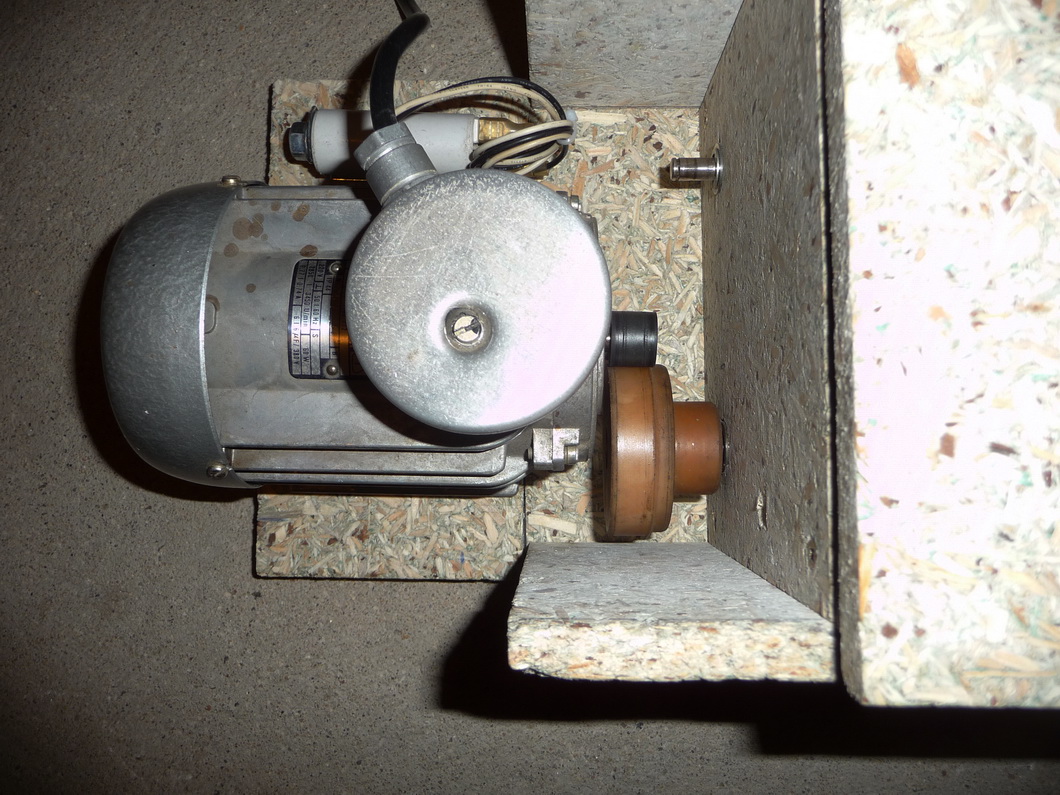 Motor v tomto případě není krytován kvůli chlazení aby se nepřehříval. Daní je vyšší hlučnost mletí. Nakonec jsem ještě upravil hnací hřídel, na kterou jsem místo ozubeného kola osadil silonové hladké kolečko s větší dosedací plochou a na hřídel motoru gumový váleček, nakonec to není tolik hlučné.