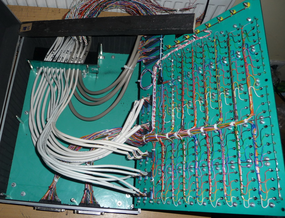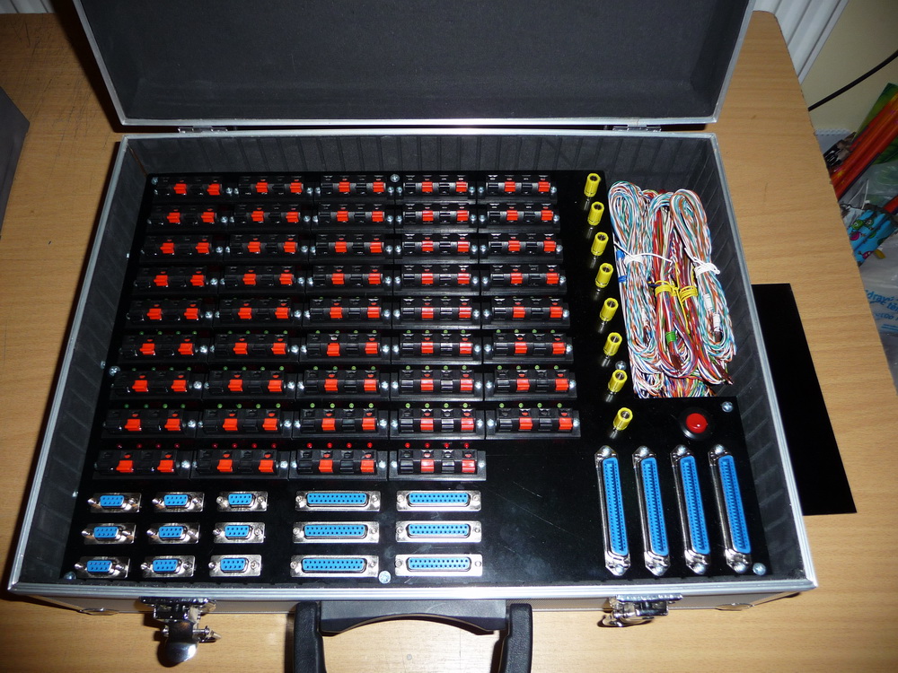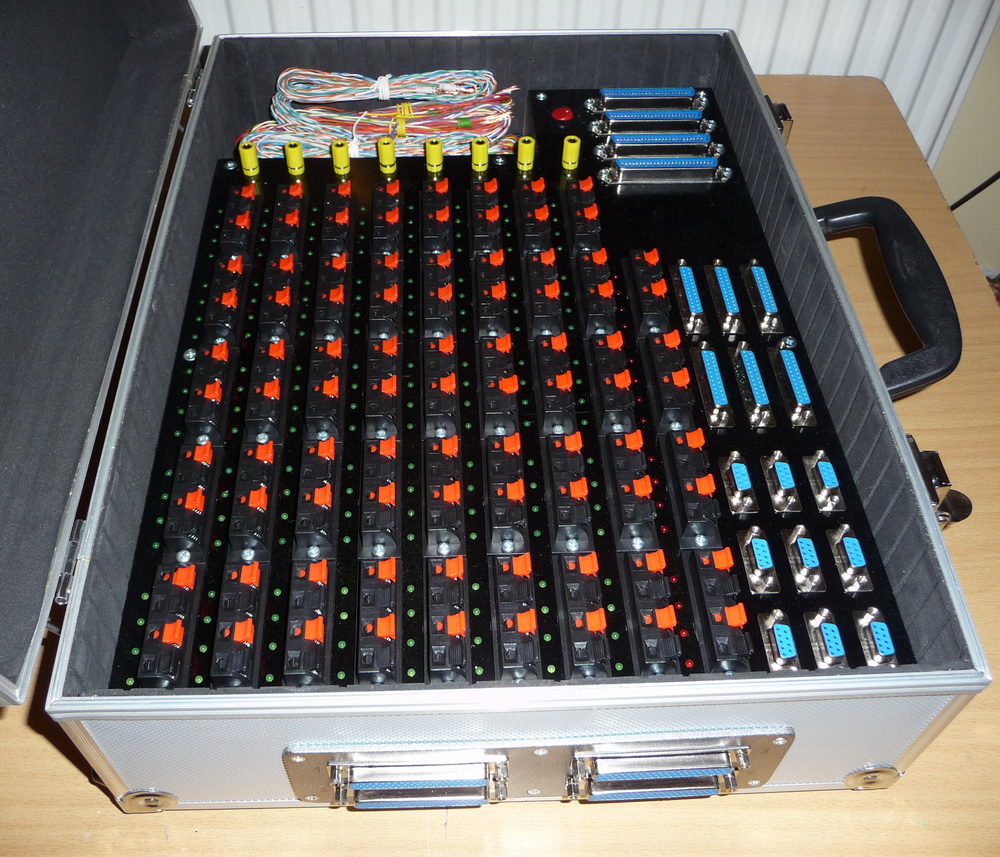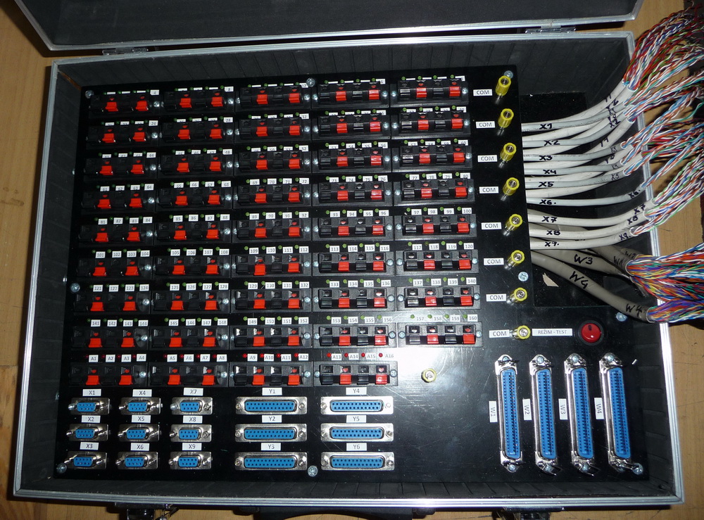 Pochopitelně s modernizací odpalovacího pultu v roce 2015 prošel modernizací i kufr se svorkama pro napojení vedení a palníků. Na obrázcích níže je tzv. rozhraní pro palníky na 160 topů + 16 topů pro anonce nebo zálohy. Do kufru byly instalovány konektory CANON a CENTRONIX pro snadnější a rychlejší napojení v terénu. Tyto konektory jsou vyvedeny na jednotlivých kabelech, které vyúsťují na boku kufru a je možno libovolně napojovat do svorek. Konektory jsou rovněž naletovány i na propojovacích kabelech k paletám nebo hnízdům s pyrotechnickými výrobky a výborně se osvědčily hlavně v zimním období, kdy nemusíme všechno napojovat jednotlivě do svorek před ohňostrojem. Vše se připraví doma v teple a v terénu jen propojí kabelem na příslušný konektor. Ani zde nechybí zpětná kontrola správného zapojení palníků a virtuální kontrola odpalů v podobě LED diod.
