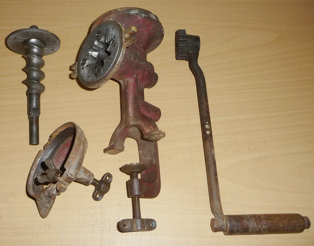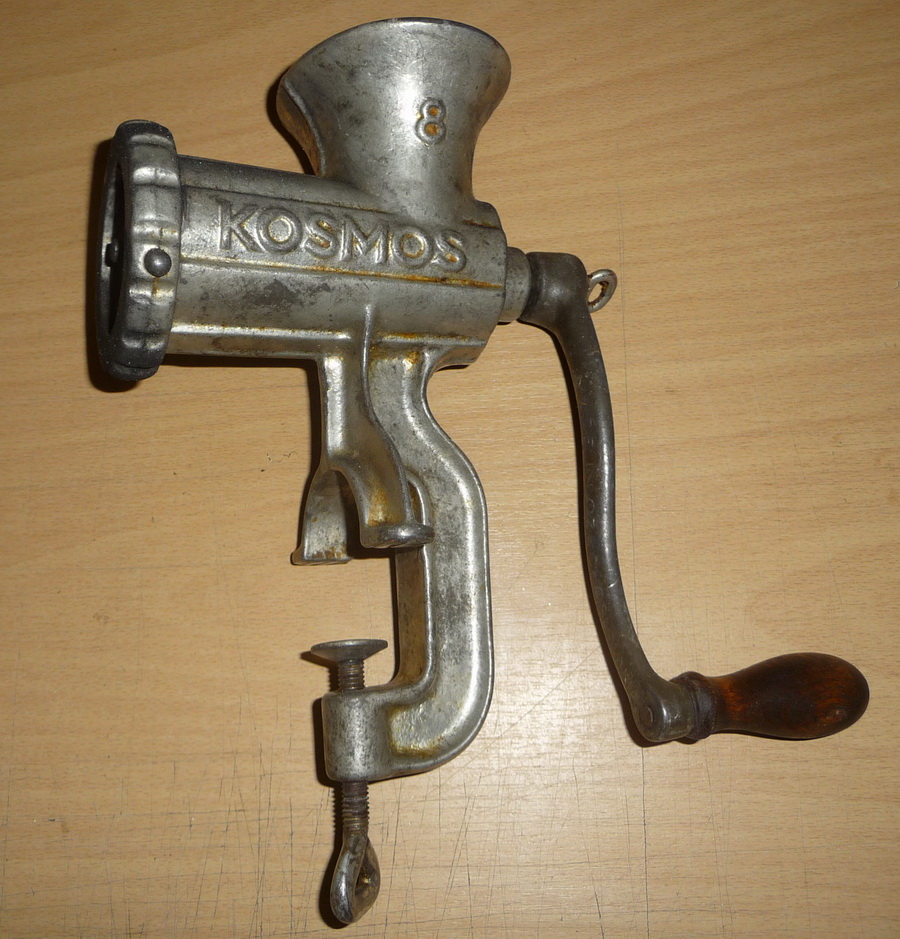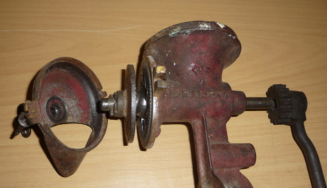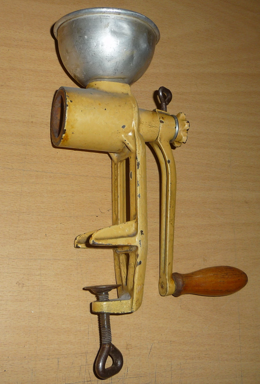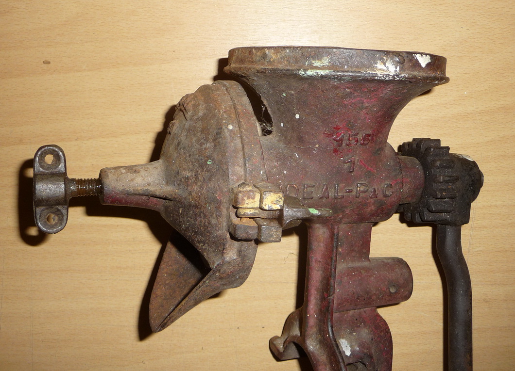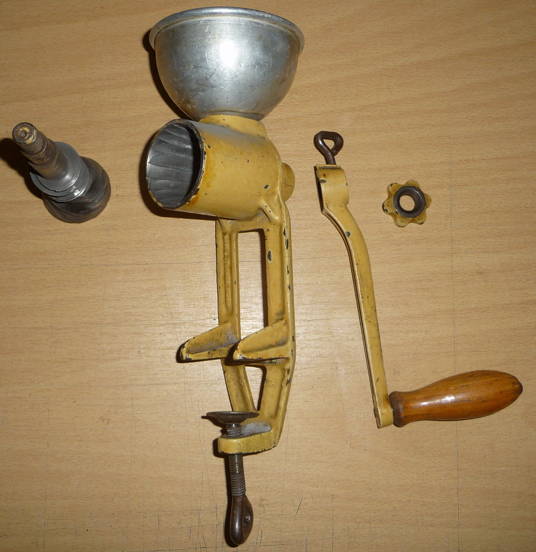 Původně byl tento hodně starý ruční mlýnek určen pro drcení obilovin a mletí mouky, nyní nám může posloužit třeba na drcení kovových špon a třísek. (titan, hliník, elektron a pod.)