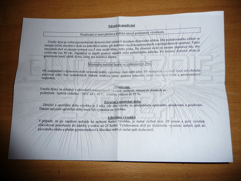 Součástí balení je 3x1 kg pyrotechnické slože, zelená zápalnice a návod k použití